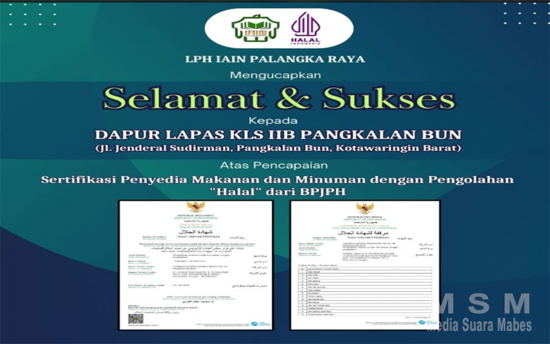 MahesaMediaCenter, Pangkalan Bun – Dapur Lembaga Pemasyarakatan (Lapas) Kelas IIB Pangkalan Bun raih sertifikat halal dari Badan Penyelenggara Jaminan Produk Halal Kementerian Agama Republik Indonesia (Kemenag RI) untuk penyelenggara makanan dan minuman dengan pengolahan.