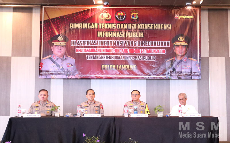 MahesaMediaCenter, Lampung – Tim DivHumas Polri gelar bimbingan teknis dan uji konsekuensi informasi publik mengenai klasifikasi Informasi yang dikecualikan berdasarkan uu no. 14 tahun 2008 tentang keterbukaan informasi publik, bertempat di hotel novotel Bandar Lampung, kamis 25/7/24