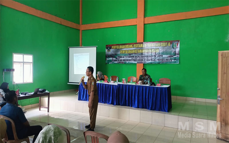 MahesaMediaCenter, Pringsewu – Satuan tugas TNI Manunggal Membangun Desa (TMMD) yang ke-121 Kodim 0424/Tanggamus mengandeng Dinas Pertanian dan Perkebunan Kab. Pringsewu melaksanakan sasaran non fisik dengan menggelar penyuluhan pertanian serta pemberian bibit kepada kelompok tani yang dilaksanakan di Aula Pekon Fajar Mulya Kec. Pagelaran Utara. Selasa (06/08/2024).