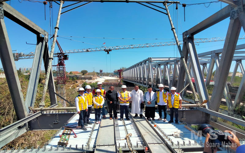 Pantauan media ini pekerjaan perakitan rangka baja, puluhan pekerja telah diterjunkan ke lokasi jembatan untuk menangani item tersebut.