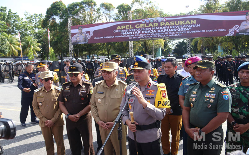 MahesaMediaCenter, Pontianak Kalbar – Dalam upaya menjaga keamanan dan ketertiban masyarakat (kamtibmas) menjelang Pemilihan Kepala Daerah (Pilkada) Serentak 2024, Polda Kalimantan Barat menggelar apel gelar pasukan di Alun-alun Kapuas. Kegiatan yang dipimpin langsung oleh Kapolda Kalbar, Irjen Pol Pipit Rismanto, S.I.K., M.H., ini menandai dimulainya Operasi Mantap Praja Kapuas 2024. Senin, (25/08)