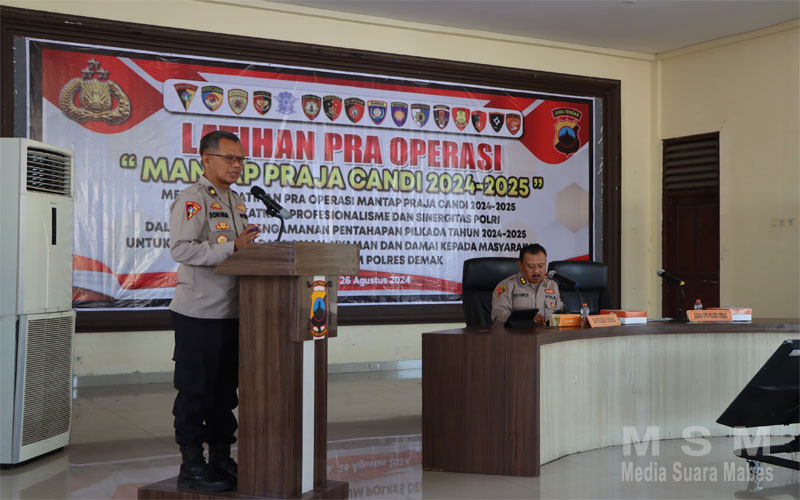 MahesaMediaCenter, Demak – Polres Demak menggelar Latihan Pra Operasi (Latpara Ops) Mantap Praja Candi 2024-2025 di Pendopo Parama Satwika Polres Demak, Senin (26/8/2024).