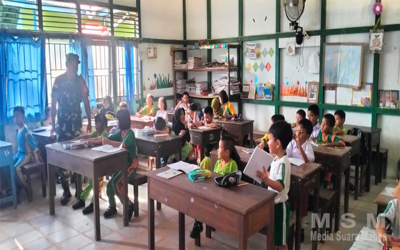 Serda Sutejo menyampaikan, “Melalui program TNI peduli pendidikan Babinsa menyambangi Sekolah Dasar guna memberikan materi pelajaran.