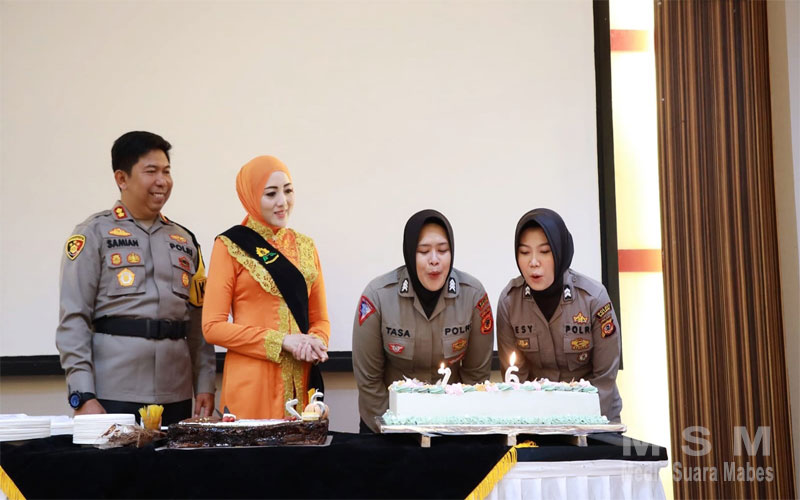 Potongan kue ulang tahun dari Ibu Asuh Polwan Sukabumi Ny. Endah Samian diterima oleh Iptu Bayu Sunarti yang saat ini menjabat sebagai Kapolsek Lengkong Polres Sukabumi, sebagai perwakilan dari anggota Polwan.