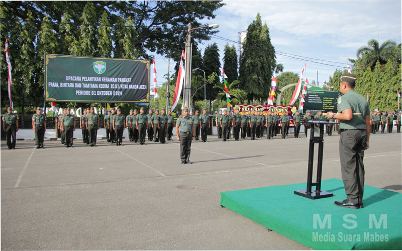 MahesaMediaCenter, Banda Aceh – Dandim 0101/Kota Banda Aceh, Kolonel Czi Widya Wijanarko, S.Sos., M.Tr (Han), memimpin upacara pelantikan kenaikan pangkat Periode 01 Oktober 2024 bagi 103 personel Kodim 0101/KBA pada Selasa (01/10/2024), yang berlangsung di halaman Makodim 0101/KBA, Jalan S.T.A Mahmudsyah No. 32, Gampong Baru, Kecamatan Baiturrahman, Kota Banda Aceh. Upacara tersebut berjalan dengan penuh khidmat dan dihadiri oleh personel Kodim 0101/KBA serta anggota Persit KCK Cabang XXVII Kodim 0101 PD Iskandar Muda.