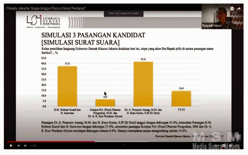 Dikatakan Lembaga Survei Indonesia menerbitkan hasil survei elektabilitas Pasangan Ridwan Kamil-Suswono 37,4 %, Dharma-Kun 6,6 %, Pramono-Rano 41,6%. Belum menentukan pilihan 14,4 %. Selisih antara Ridwan Kamil-Suswono dengan Pramono-Rano hanya 4%