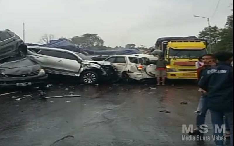 Dalam sebuah unggahan video dan foto yang beredar di media sosial, tampak sejumlah kendaraan terlibat tabrakan beruntun bertumpuk dan dalam keadaan rusak berat, bahkan terdapat sebuah kendaraan yang sampai berada diatas kendaraan lainnya.