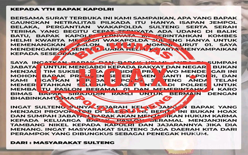 “Konten yang menarasikan, pergantian Wakapolda Sulteng untuk memenangkan paslon 01 Beramal, Polda Sulteng tidak netral dimana Kapolda Sulteng memerintahkan para kasatintel dan Dirbinmas melalui para Bhabinkamtibmas, saya pastikan itu fitnah dan hoax” tegas Kabidhumas.