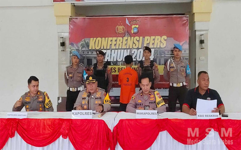 Konferensi Pers ini dipimpin langsung oleh Kapolres Belitung Timur AKBP Indra Feri Dalimunthe, S.H., S.I.K., M.H., dan didampingi oleh Wakapolres Belitung Timur Kompol Evry Susanto, S.H., S.I.K., M.H., Kapolsek Gantung AKP Fajar Riansyah Pratama, S.T.K. S.I.K., M.H., KBO Sat Reskrim Polres Belitung Timur Ipda Muhammad Alimin, S.E. dan dihadiri oleh para awak media yang bertugas di Wilayah Kabupaten Belitung Timur.