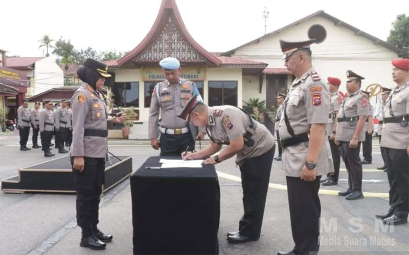 MahesaMediaCenter (Jaringan MSM), Bukittinggi Sumbar – Kapolresta Bukittinggi, Kombes Pol. Yessi Kurniati memimpin upacara serah terima jabatan delapan perwira kepolisian yang bertugas di Polresta setempat. Mutasi awal 2025 ini diharapkan mampu menyelesaikan kasus yang menjadi tunggakan tugas pejabat lama kepolisian.