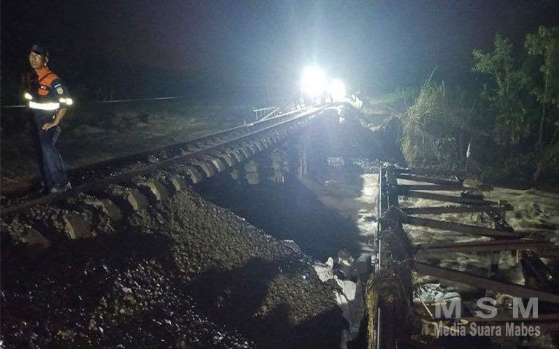 Setelah itu, bantalan rel yang sudah dikasih landasan batu akhirnya benar-benar kehilangan kemampuan untuk menahan derasnya arus air dan kembali longsor terbawa air.