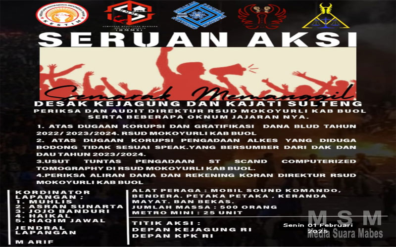 Berdasarkan siaran pers yang diterima awak media, senin, 28 Januari 2025. Mereka mengemukakan hal ini diberangkatkan dari dugaan korupsi dan gratifikasi sehingga aksi tersebut akan dilakukan untuk mendesak pemerintah memeriksa dan mengaudit Direktur Rumah Sakit Umum Daerah (RSUD) Mokoyurli Kabupaten Buol, Sulawesi Tengah.