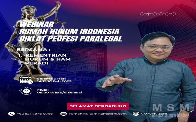 MahesaMediaCenter (Jaringan MSM), Jakarta – Rumah Hukum Indonesia (RHI) mengadakan Pendidikan dan Pelatihan (Diklat) Paralegal tanggal 14-16 Februari 2025, dengan 10 Mata Pelajaran wajib sebagai Kompetensi seorang Paralegal. Narasumber yang tampil adalah : Para Pakar Hukum, Praktisi Hukum, DPN Peradi, Badan Pembinaan Hukum Nasional (BPHN), Akademisi, dan RHI.