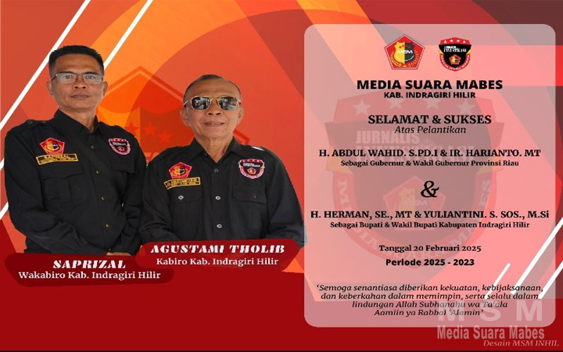 MahesaMediaCenter (Jaringan MSM), Kab. Indragiri Hilir – Media Suara Mabes Kabupaten Indragiri Hilir mengucapkan selamat dan sukses atas pelantikan H. Abdul Wahid, S.Pd.I dan Ir. Harianto, MT sebagai Gubernur dan Wakil Gubernur Provinsi Riau.