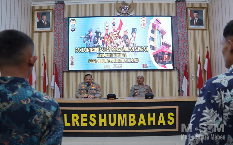 MahesaMediaCenter (Jaringan MSM), Humbahas – Kapolres Humbang Hasundutan AKBP Hary Ardianto SH SIK MH memimpin Penandatanganan pakta integritas dan pengambilan sumpah peserta, panitia, dan Orang tua peserta penerimaan terpadu calon anggota Polri tahun 2025 di aula DP Silitonga Polres Humbang Hasundutan pada hari Kamis (07/03/2025).