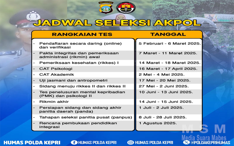 Jadwal Seleksi Penerimaan Terpadu Calon Taruna Akpol, Bintara, dan Tamtama Polri Polda Kepri TA 2025