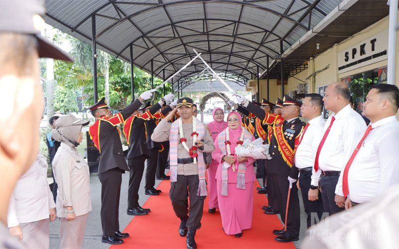 Setelah melewati gerbang pora, keduanya berpamitan sambil menyapa satu persatu personel yang berjejer sepanjang jalan menuju gerbang keluar Polres Kampar. Banyak mata anggota berkaca-kaca saat melepas kepindahan AKBP Ronald Sumaja yang dikenal dekat dengan anggota ini.