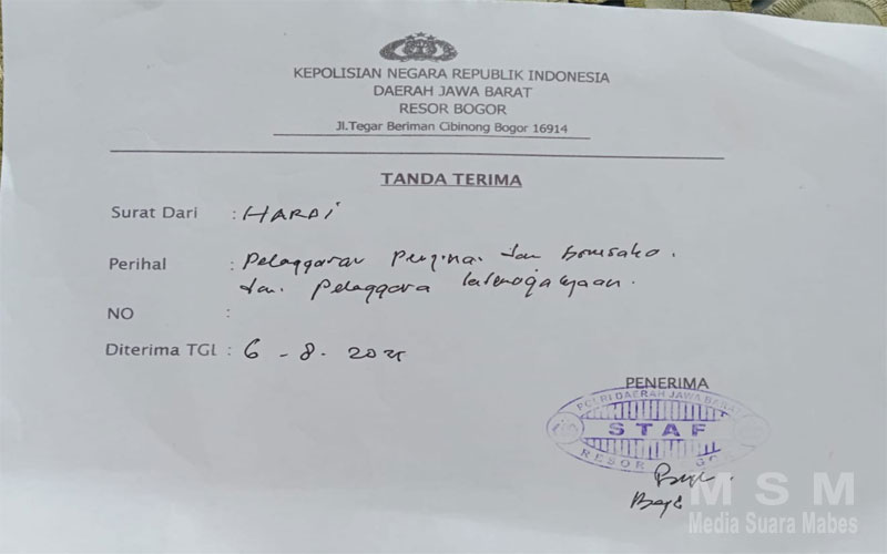 “Laporan terkait pengaduan dugaan tindak pidana tersebut telah diterima secara resmi oleh Polres Bogor dengan bukti tanda terima tertanggal Rabu,6 Agustus 2025.” tegas Adv. Lilik Adi Gunawan,SH.
