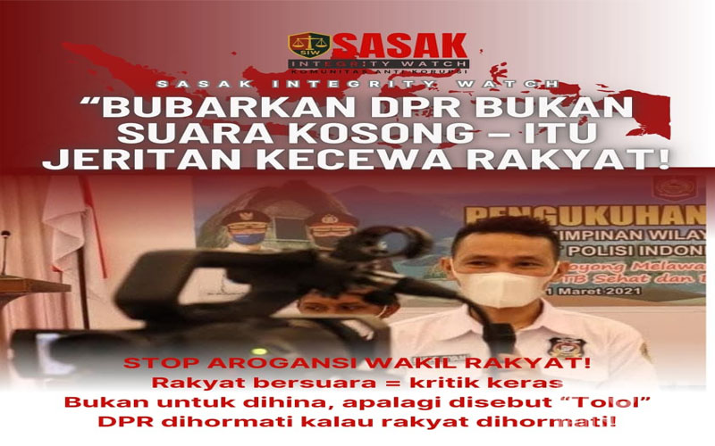 MediaSuaraMabes, Mataram – Dewan Pimpinan Nasional Sasak Integrity Watch (DPN SIW), Syamsuddin menyampaikan kritik keras atas pernyataan Anggota DPR, Sahroni, yang menyebut bahwa seruan masyarakat untuk “Bubarkan DPR” adalah sikap “paling tolol se-dunia”. Pernyataan tersebut dinilai arogan, tidak bijak, dan mencederai martabat rakyat yang sesungguhnya adalah pemilik kedaulatan.