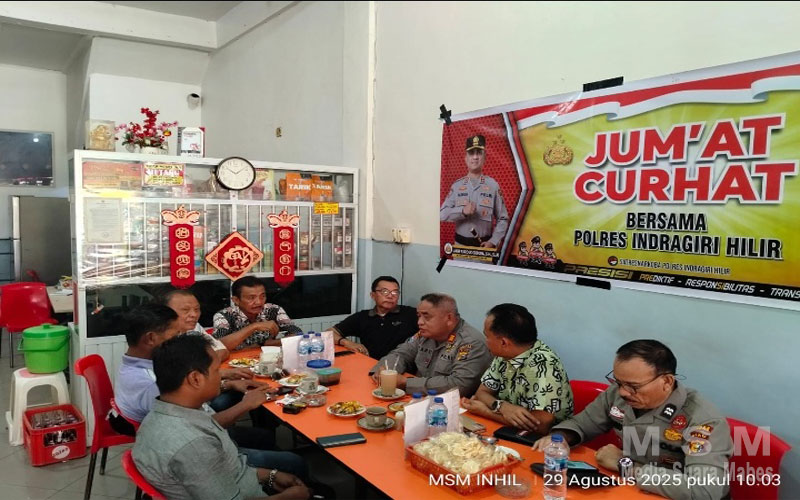MediaSuaraMabes, Kab. Indragiri Hilir Tembilahan – Kepolisian Resor Indragiri Hilir (Polres Inhil) kembali melaksanakan program “Jumat Curhat” sebagai wadah komunikasi dan penyerapan aspirasi masyarakat. Kegiatan kali ini digelar oleh Satuan Reserse Kriminal (Sat Reskrim) Polres Inhil dengan menghadirkan berbagai elemen masyarakat di Kabupaten Indragiri Hilir.