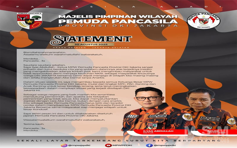 Sehubungan dengan situasi yang terjadi, Bung Ilyas juga mengimbau kepada seluruh keluarga besar MPW Pemuda Pancasila Provinsi DKI Jakarta — mulai dari tingkat MPC, PAC, Ranting, hingga Anak Ranting — untuk tetap tenang dan meningkatkan kewaspadaan dalam menyikapi perkembangan situasi terkini.