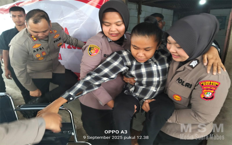 MediaSuaraMabes, Bekasi – Dalam rangka memperingati Hari Ulang Tahun Polisi Wanita (Polwan) ke-77, Wakapolres Metro Bekasi bersama jajaran Mapolsek Tarumajaya melaksanakan kegiatan sosial dengan memberikan bantuan kursi roda kepada warga kampung telar tanggul RT 001 RW 027 Desa segara jaya penyandang disabilitas di wilayah Tarumajaya, Kabupaten Bekasi.