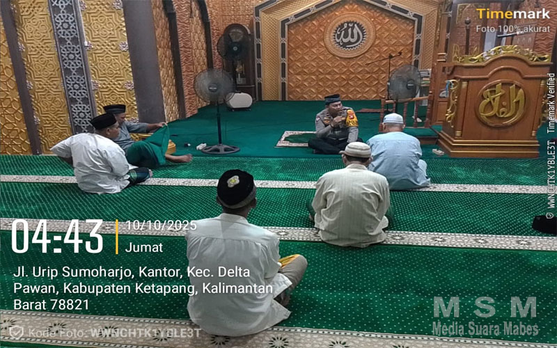 Ketapang, Polda Kalbar — Kapolsek Delta Pawan, Ipda Chepry Perahera, S.H., bersama Bhabinkamtibmas melaksanakan kegiatan Subuh Keliling (Subuh Suling) di Masjid Al-Falah, Jalan Urip Sumoharjo, Kelurahan Kantor, Kecamatan Delta Pawan, Kabupaten Ketapang, Jum’at, 10 Oktober 2025.