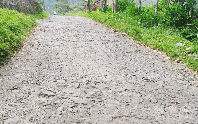 dan genangan air saat musim hujan, jalan tersebut sudah menjadi jalan bebatuan, mirip jalan kebo, permukaan jalan sangat tidak rata, Minggu 12 Oktober 2025.