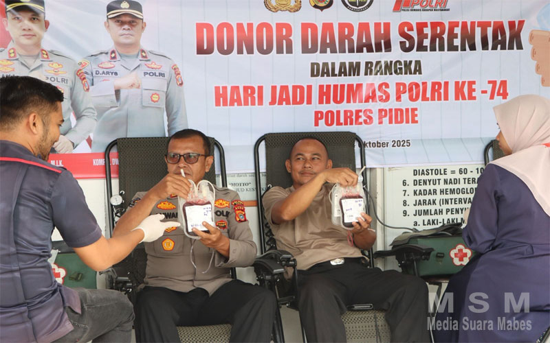 MediaSuaraMabes, Sigli – Dalam rangka memperingati Hari Jadi Humas Polri ke-74 Tahun 2025, Polres Pidie melalui Seksi Humas bekerja sama dengan Seksi Dokkes dan Palang Merah Indonesia (PMI) Kabupaten Pidie menggelar kegiatan Bakti Kesehatan Donor Darah pada Rabu (22/10/2025).
