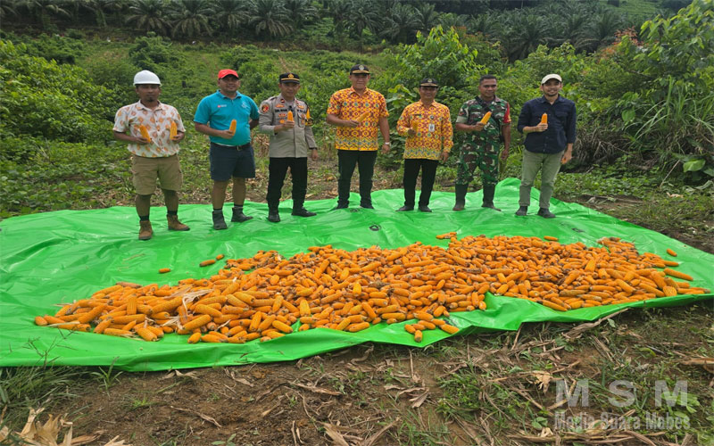 MediaSuaraMabes, Ketapang Kalbar — Kapolsek Jelai Hulu Ipda Zaenal Mutakhir, S.H. bersama Camat Jelai Hulu Seth Ariel, S.Th., Kepala Desa Periangan Paskalis Didi, serta Manager Gaharu Estate PT Bangun Nusa Mandiri (BNM) Ginting, melaksanakan kegiatan pemanenan jagung hibrida di areal perkebunan PT BNM, Desa Periangan, Kecamatan Jelai Hulu, pada Kamis, 13 November 2025.