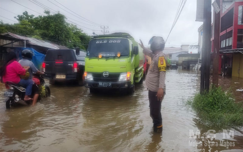Bhabinkamtibmas Polsek Benua Kayong Laksanakan Pengaturan Lalu Lintas dan Bantu Warga Terdampak Banjir Rob di Jalan Pawan 1