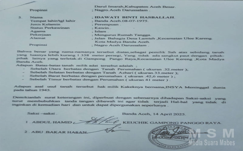 MediaSuaraMabes, Banda Aceh — Kepala Perwakilan Wilayah (Kaperwil) Media Suara Mabes Provinsi Aceh, Hanafiah, mengecam keras tindakan Khairuddin, Geuchik Gampong Pangoe, Kecamatan Ulee Kareng, Kota Banda Aceh, yang diduga melakukan manipulasi harta warisan milik warga tanpa melalui proses musyawarah dengan para ahli waris.