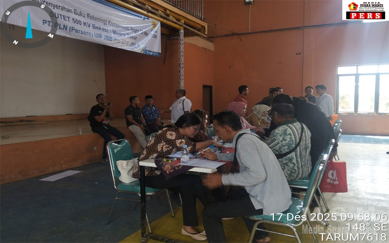 MediaSuaraMabes, Tarumajaya – PT PLN (Persero) UIP JBB bersama UPP JBB 3 melaksanakan kegiatan pembayaran kompensasi Right of Way (ROW) Saluran Udara Tegangan Ekstra Tinggi (SUTET) 500 KV jalur Bekasi–Muara Tawar melalui penyerahan buku rekening kepada warga terdampak.