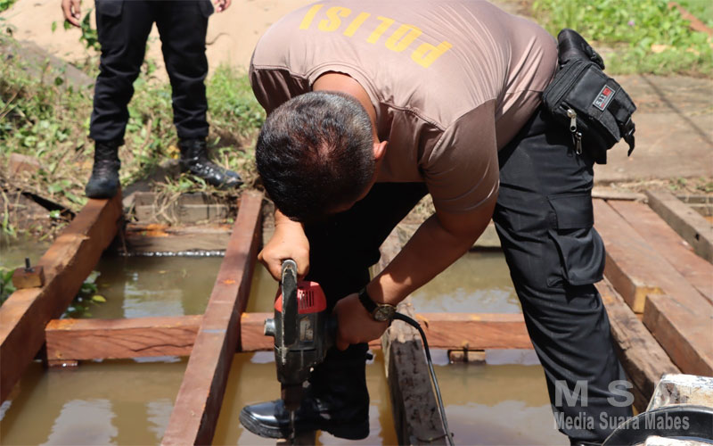 Personel kepolisian bersama Kompi Brimob Ketapang dan masyarakat bahu-membahu melakukan pekerjaan mulai dari pembongkaran bagian jembatan yang rusak, pemasangan material baru, hingga perataan dan penguatan konstruksi jembatan. Kebersamaan dan semangat gotong royong terlihat jelas selama kegiatan berlangsung.