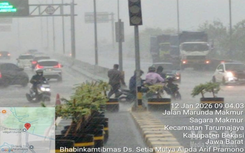 Bertempat di depan pintu gerbang Tol Tarumajaya, Aipda Arif Pramono terlihat mengarahkan dan menuntun warga serta pengendara yang terjebak banjir agar dapat melintas dengan aman. Tanpa menghiraukan derasnya hujan dan kondisi jalan yang tergenang, ia tetap menjalankan tugas demi kelancaran dan keselamatan masyarakat.