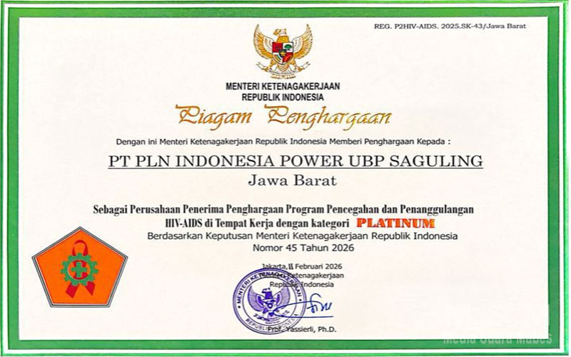 MediaSuaraMabes, Bandung – PLN Indonesia Power UBP Saguling kembali menorehkan prestasi dengan meraih penghargaan kategori Platinum dalam program Pencegahan dan Penanggulangan (P2) HIV/AIDS di tempat kerja. Penghargaan ini diberikan berdasarkan Keputusan Menteri Ketenagakerjaan Republik Indonesia sebagai bentuk apresiasi atas komitmen perusahaan dalam menciptakan lingkungan kerja yang sehat, aman, dan inklusif.