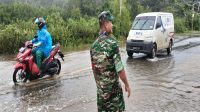 Tetap semangat, Babinsa karimunting 1202-03/Kodim Sungai Duri Mengarahkan Kendaraan Yang Melewati Areal Banjir